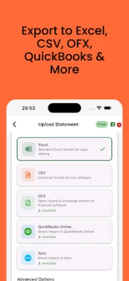 Export to Excel (.xlsx), CSV, OFX, QuickBooks (.qbo), and Xero